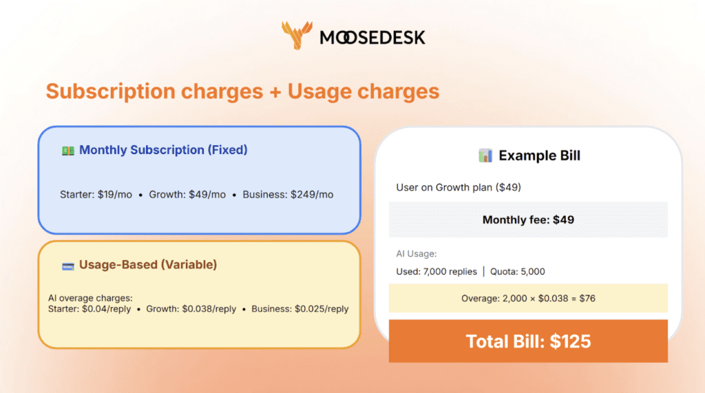 MooseDesk uses a hybrid pricing model that combines two types of charges: Fixed Monthly Subscription Fee & Usage-Based Charges