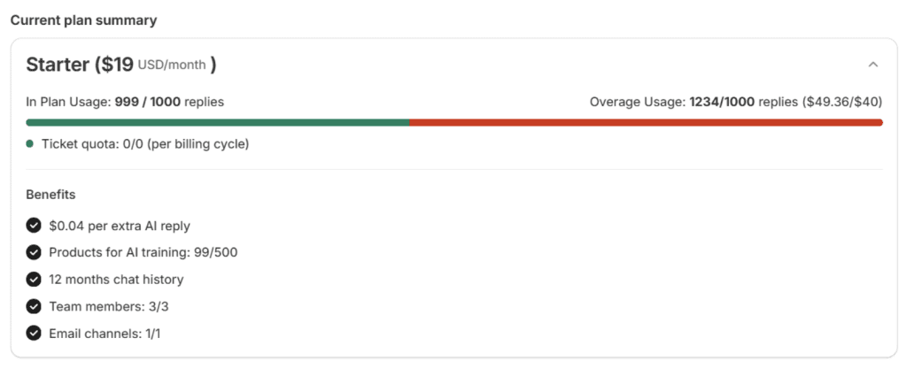 - Overage quota (additional AI replies beyond included amount)
