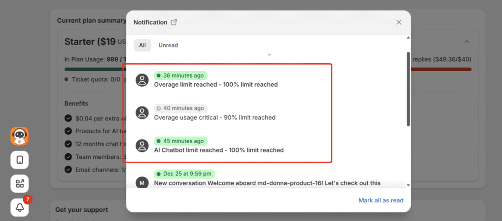 - Overage Usage: The number of AI replies used beyond your included quota, which will be charged at your plan’s overage rate.
