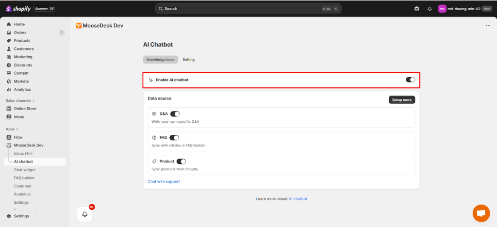 Go to AI Chatbot > Knowledge Base. Then Switch Enable AI Chatbot on.
