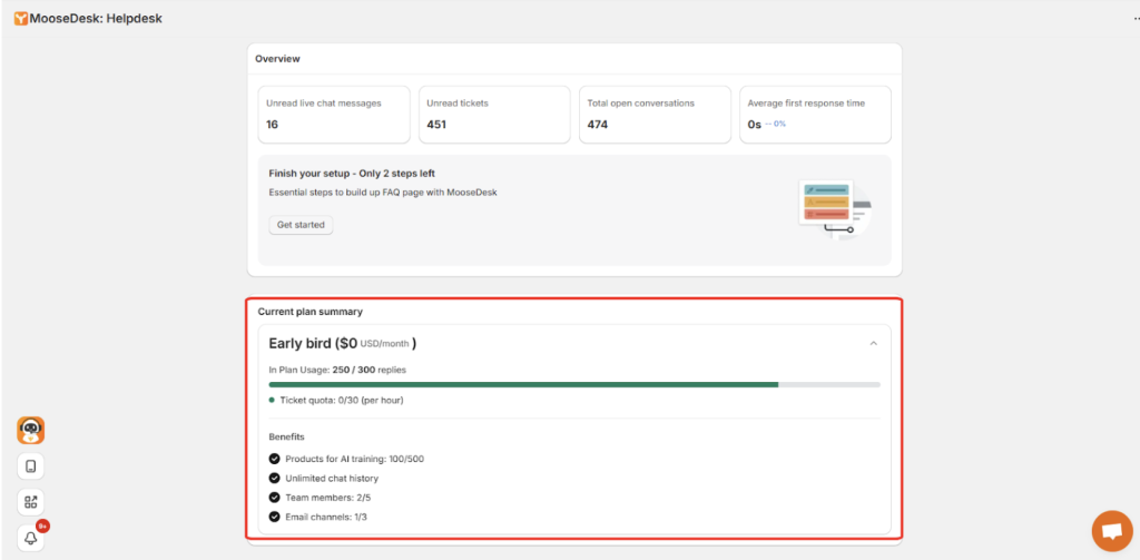 On the Dashboard, you will see your plan listed as Early Bird ($0/month) along with usage numbers such as AI replies, products for AI training, team members, or email channels.