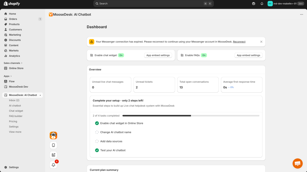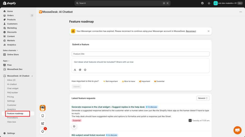 The embedded version of MooseDesk is integrated directly into your Shopify admin interface. This is the main version and offers all available features while adhering to Shopify’s design guidelines.