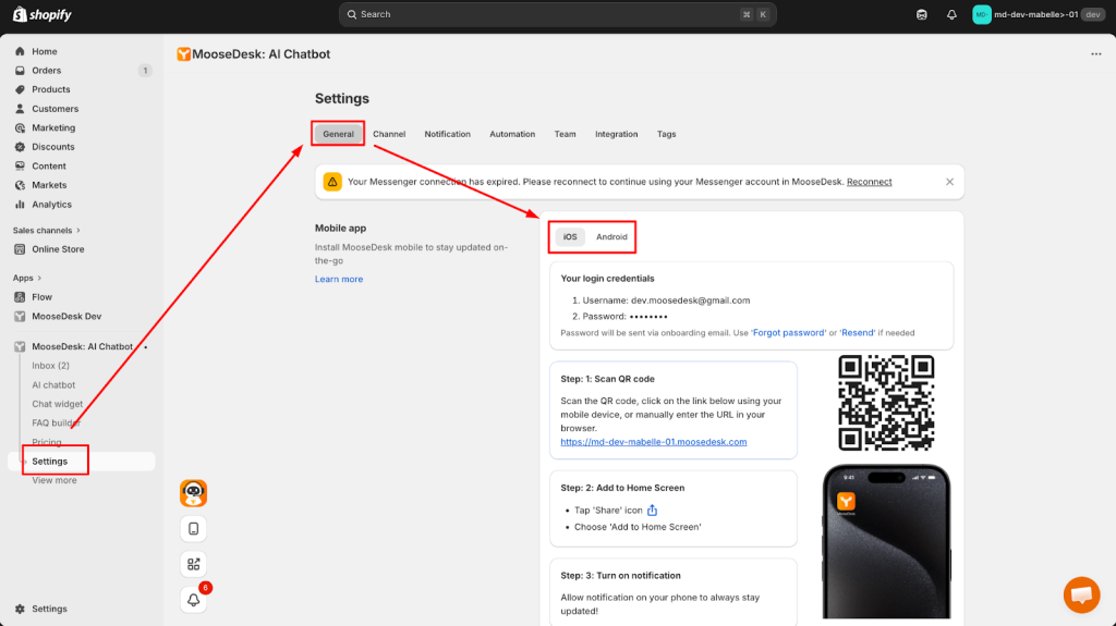 Once installed, MooseDesk offers three platforms for access: an embedded version within Shopify admin, a standalone web version outside of Shopify admin, and a mobile app.
